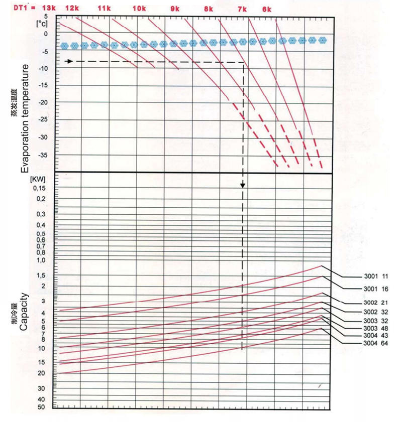 | Model | Kapasite R404A/R507A (KW) | Yüzey (m²) | Tüp hacmi (DM³) | Boyutlar (mm) | N.W. (Kg) | Bağlantı (∮mm) | |||||